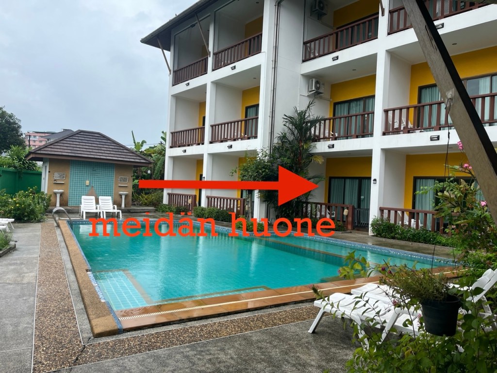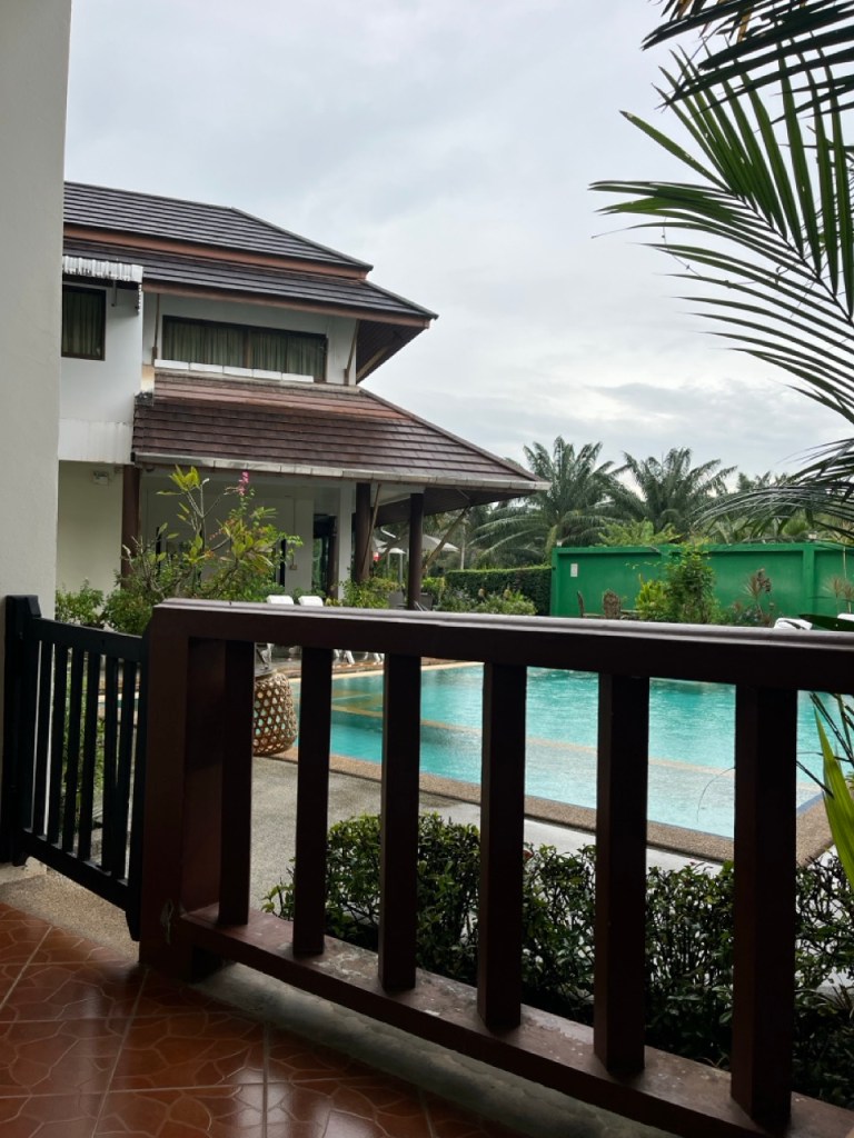 Olin varannut meille huoneen alimmasta kerroksesta. Parvekkeelta pääsee suoraan altaaseen.