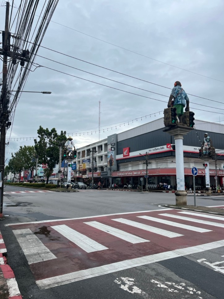 Tässä kaupunkia halkaisevassa kadussa on mielenkiitoiset liikennevalopylväät. Ukot kantavat ikään kuin laukkuja, joissa sitten liikennevalot ovat.