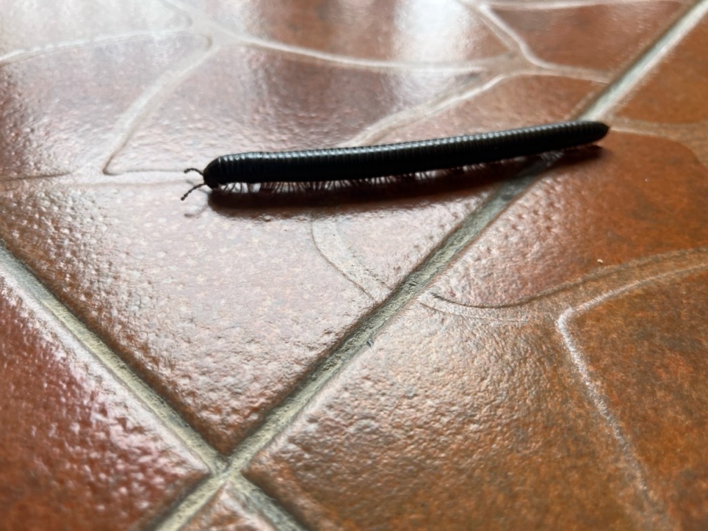 Parvekkeella kuvatessa ja ennen kaikkea kytätessäni kuvattavia, käveli tällainen reilun 10 cm pitkä tuhatjalkainen läpi lattian. Poistui ilman kehoituksia aikansa käveltyään ja aina seinään törmättyään.