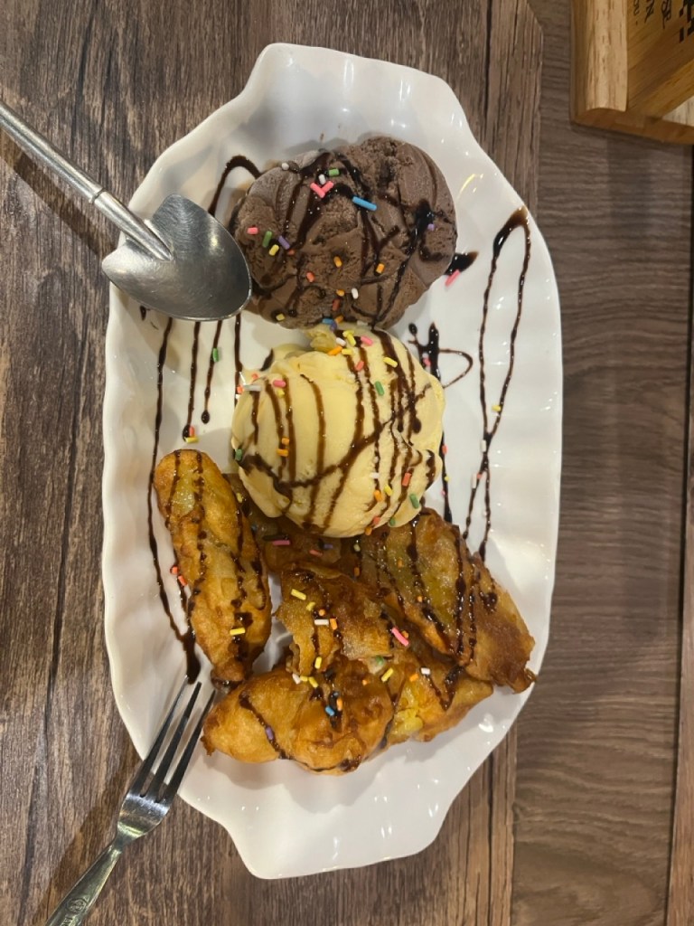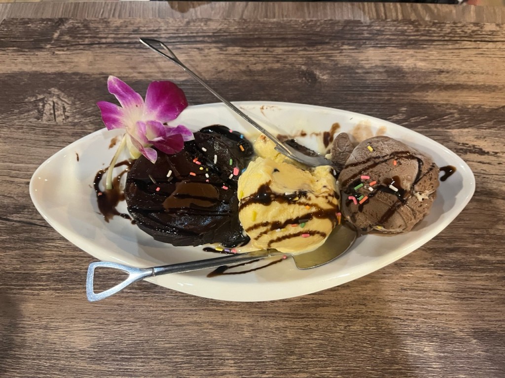 Madamen jälkiruoka. Tarkemmin kun katsot kuvaa, näet kaksi lapiota. Siispä Madam joutui lapiohommiin 😉 Kukapa olisi uskonut, että Thaimaassa joutuu lapion varteen.