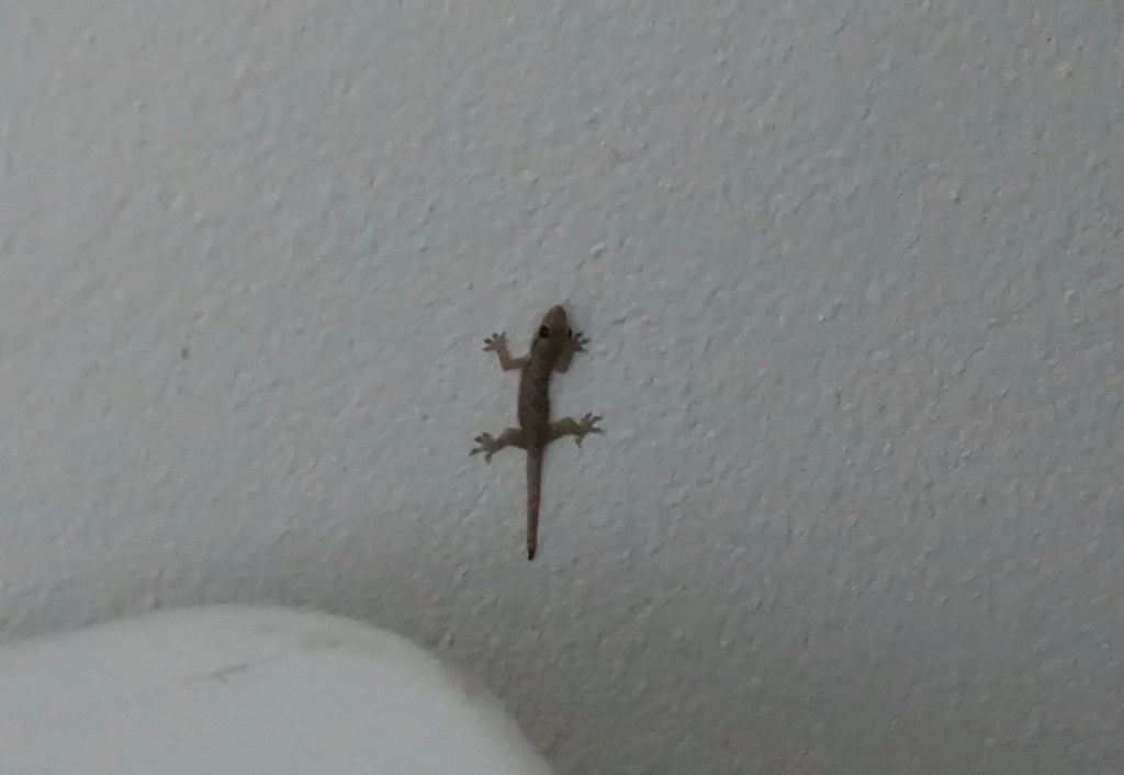 Gekko tuli vissiin sadetta pakoon parvekkeemme seinälle.